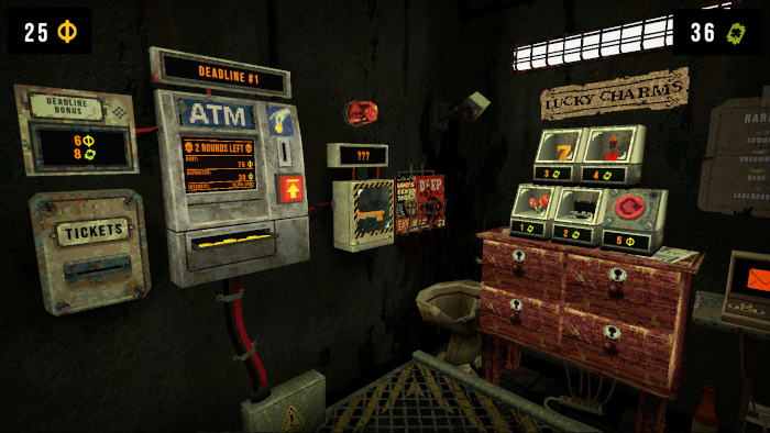 狭苦しい独房に閉じ込められてしまった貴方、つまりプレイヤーは机の上のスロットマシンを回し、次々と期限が迫ってくる借金返済をし続ける、という内容の作品です。