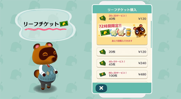 課金要素がまったくない、というわけでは勿論なく「どうぶつの森 ポケットキャンプ」での課金要素には「リーフチケット」というアイテムが使用されます。