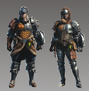 シリーズファンには懐かしい、初代モンスターハンターに登場した防具のセット(頭、胴、腕、腰、脚)ですね。