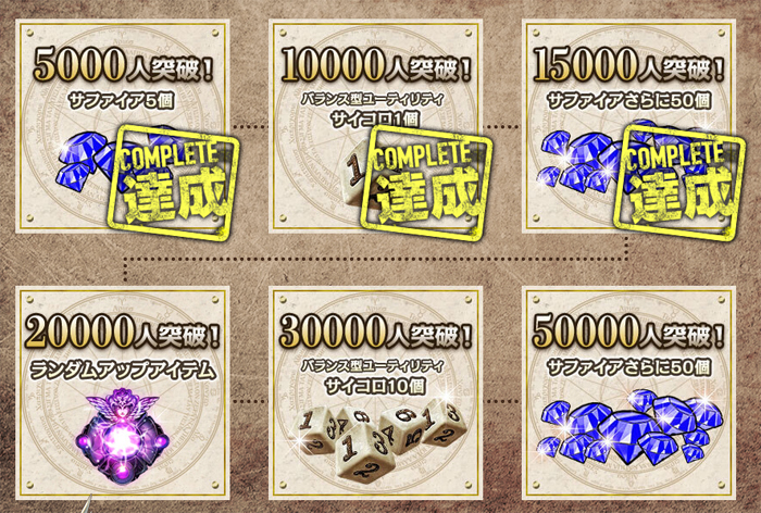 2017年4月19日現在では15,000人を突破、恐らく「ガチャ」等に使用するであろう「サファイア」のプレゼントなどが決定しています。