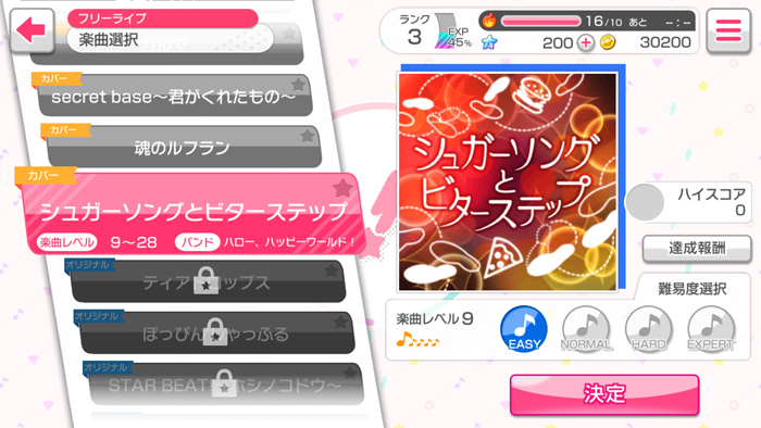 といった感じですね、一応、ちょっと手間をかければガチャを最初に5回引く、という事もできますが、ハード以上の楽曲でフルコンボを達成しないといけません。
