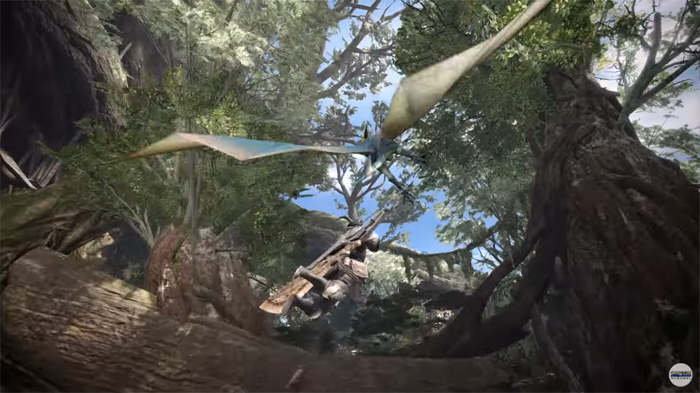 「WORLD」では、広いフィールドを駆け抜けるためなのか、ロープを使って樹から樹へ飛び移ったり、小型の翼竜に捕まって空を飛んだりしているのが確認できます。