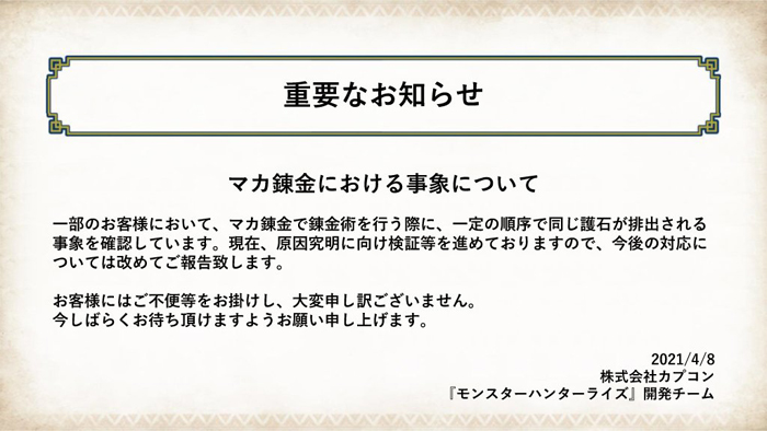 しかしながら、これらの「同じ護石が排出されて固定化される」という事自体は公式サイドでも認知しているようで、これらは当然仕様ではなくバグである様子。